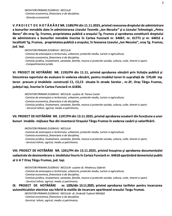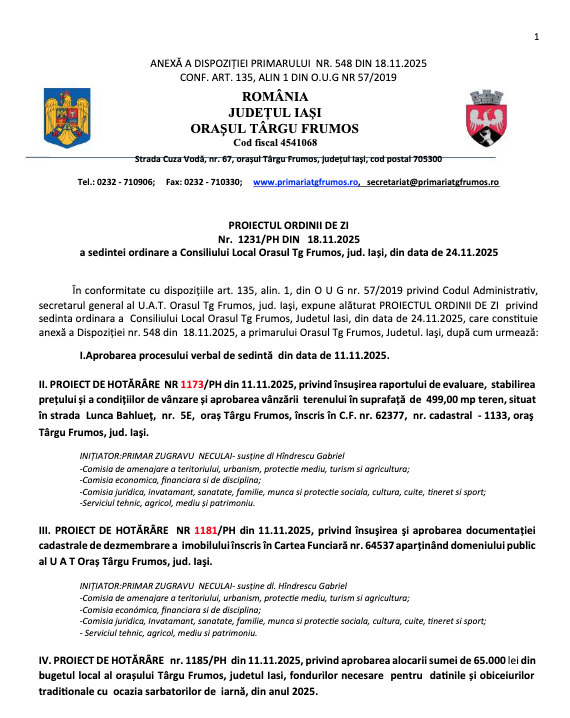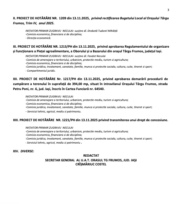 Luni, 24 noiembrie 2025, consilierii locali din Târgu Frumos se vor întâlni într-o nouă ședință ordinară în care vor fi dezbătute 12 proiecte importante. Aleșii locali vor dezbate și vota pe subiecte ce țin atât de gestionarea patrimoniului orașului, cât și de organizarea activităților de sezon.