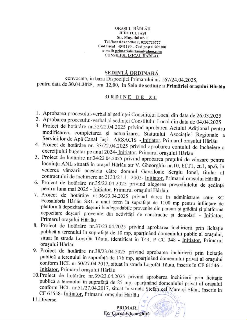 Ședință de Consiliu Local la final de lună în orașul Hârlău. Legislativul local se întrunește pe 30 aprilie, de la ora 12:00, în ședință ordinară cu 11 puncte pe ordinea de zi, ce vizează atât aspecte administrative curente, cât și decizii ce țin de gestiunea domeniului public și privat al orașului.