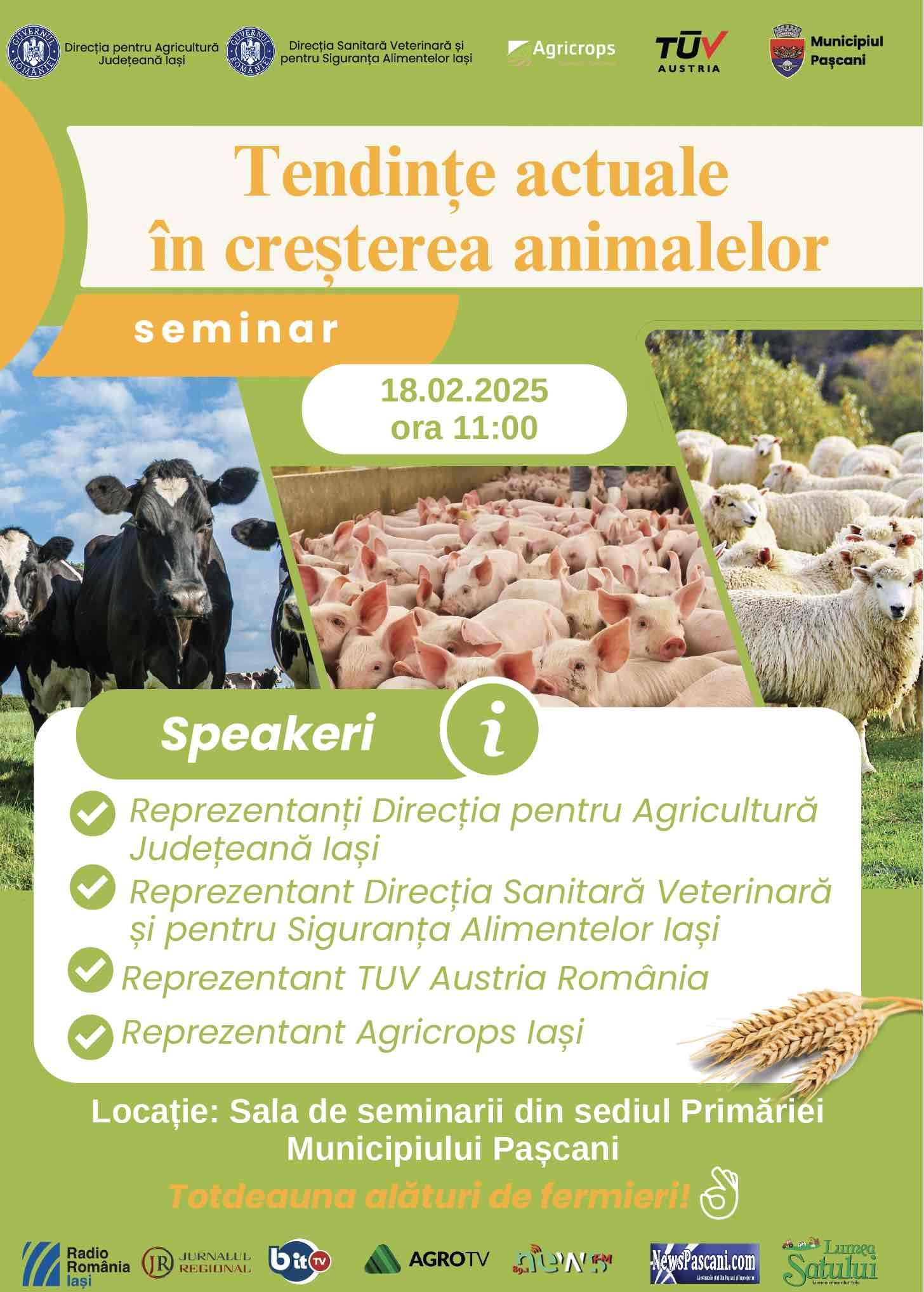 Direcţia pentru Agricultură Judeţeană Iaşi, în parteneriat cu Primăria Municipiul Pașcani, organizează în data de 18.02.2025, începând cu orele 11.00, în sala de seminarii a Primăriei Municipiului Paşcani, un eveniment dedicat crescătorilor de animale din localităţile aflate ȋn zona Municipiului Paşcani: