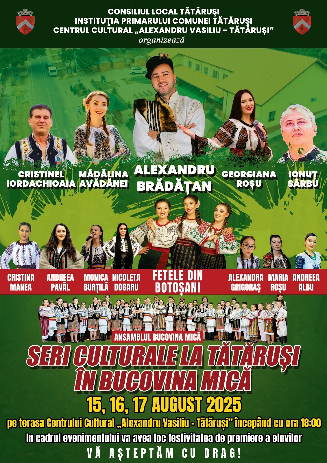 Invitație la trei seri de spectacole în comuna Tătăruși. Evenimentul este programat pe 15, 16 și 17 august, începând cu ora 18.00, pe terasa Căminului Cultural „Alexandru Vasiliu”. Conform afișului vor cânta „Fetele din Botoșani” , Cristina Manea, Andreea Pavăl, Monica Burțilă, Nicoleta Dogaru, Alexandra Grigoraș, Maria Roșu și Andreea Albu alături de Alexandru Brădățean Cristinel Iordăchioaia, Mădălina Avădanei Ionuț Sârbu și Georgiana Roșu.