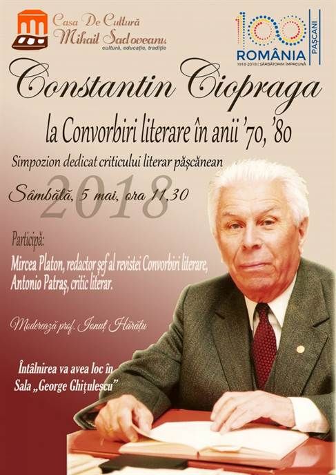 Sâmbătă, 5 mai 2018 ,ora 11.30 în sala George Ghițulescu va avea loc cea de-a V-a ediție a Simpozionului Constantin Ciopraga. Tema dezbaterii de tip masă rotundă este :Constantin Ciopraga la Convorbiri literare în anii ’70,’80. Invitați:Mircea Platon,redactor șef al revistei Convorbiri literare și criticul literarar Antonio Patraș. Moderator:prof. Ionuț Hărățu- Liceul Teoretic Miron Costin Pașcani.