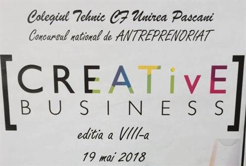 Al doilea concurs organizat la Colegiul Unirea, sâmbătă 19 mai 2018, incepand cu ora 10, este ”Creative Business”, rezervat liceenilor cu spirit antreprenorial din țară. Echipe de 3-4 elevi își vor prezenta ideile de afaceri unui juriu format din oameni de afaceri și bancheri. Fiecare plan de afacere prezentat primește din partea membrilor juriului feedback imediat, recomandări și consultanță privind dezvoltarea unei idei de afaceri. Tinerii înscriși în concurs participă la patru secțiuni: Idei de afaceri creative, Printuri de promovare, Spot publicitar, Site web companie. Școlile participante la concurs sunt: Centrul De Excelență în Economie si Finanțe, Chișinău, Colegiul Agricol Dr. C. Angelescu Buzău, Colegiul Economic „Octav Onicescu” Botoșani, Colegiul Economic „Virgil Madgearu” Bucuresti, Colegiul Economic „Virgil Madgearu” Galati, Colegiul Economic “Virgil Madgearu” Târgu Jiu, Colegiul Economic ”Costin C. Kirițescu” Bucuresti, Colegiul Economic Ion Ghica Targoviste, Colegiul Economic Râmnicu Vâlcea, Colegiul Economic Virgil Madgearu Targu Jiu, Colegiul Național Petru Rareș Beclean, Colegiul National Theodor Costescu – Drobeta Turnu Severin, Colegiul Tehnic „Gheorghe Bals„ Adjud, Colegiul Tehnic “Lorin Salagean” Drobeta Turnu Severin, Colegiul Tehnic ”Dimitrie Leonida” Iași, Colegiul Tehnic De Comunicatii „Augustin Maior”, Cluj Napoca, Colegiul Vasile Lovinescu Falticeni, Colegiului Național “Petru Rareș” Beclean, Liceul Tehnologic ”Dimitrie Filipescu”, Buzau, Liceul Tehnologic De Marină Galați, Liceul Tehnologic Economic Virgil Madgearu Iasi, Liceul Teoretic „Ion Neculce” Tg. Frumos, Liceul Teoretic „Vasile Alecsandri” Iași, Scoala Superioara Comerciala”Nicolae Kretzulescu” Bucuresti.