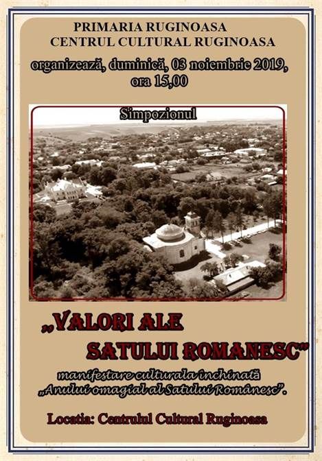 Comuna Ruginoasa va gazdui Simpozionul “ Valori ale satului romanesc”, manifestare culturala inchinata “Anului omagial al Satului Romanesc. Evenimentul va avea loc pe 3 noiembrie a.c. , la Centrul Cultural al localitatii, incepand cu ora 15:00.