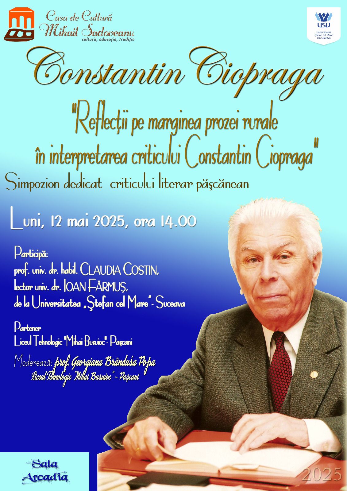 Luni, 12 mai 2025, de la ora 14.00, sala Arcadia a Casei de Cultură din Pașcani va găzdui cea de-a XI-a ediție a Simpozionului „Constantin Ciopraga”, eveniment cultural dedicat unuia dintre cei mai importanți critici literari născuți la Pașcani, la 12 mai 1916.