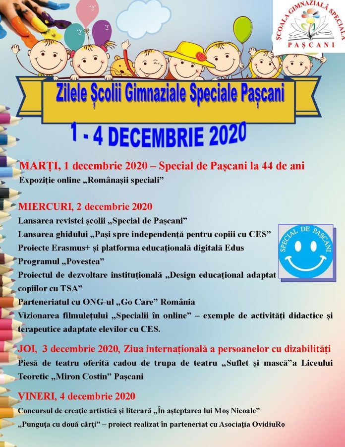 C.P. În perioada 1 – 4 decembrie 2020 Școala Gimnazială Specială Pașcani sărbătorește Zilele Școlii, marcând cei 44 de ani de existență de învățământ special și special integrat din municipiul Pașcani. Cu acest prilej, sunt planificate o serie de evenimente de amploare, dedicate atât elevilor, părinților cât și cadrelor didactice, promovând educația și valorile ei.