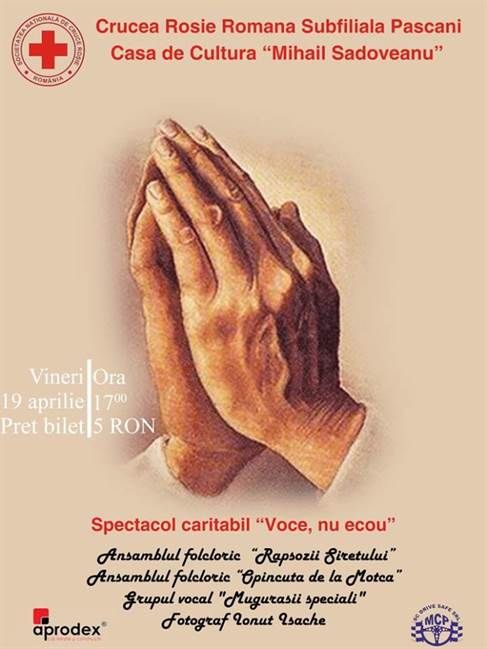 Casa de Cultura „Mihail Sadoveanu” gazduieste vineri 19 aprilie, începând cu orele 17:00, spectacolul caritabil „Voce, nu ecou!” organizat de Crucea Roșie Română Subfiliala Pașcani cu ocazia Sărbătorilor Pascale, in scopul de a ajuta o familie din satul Cozmești, Comuna Stolniceni – Prăjescu.