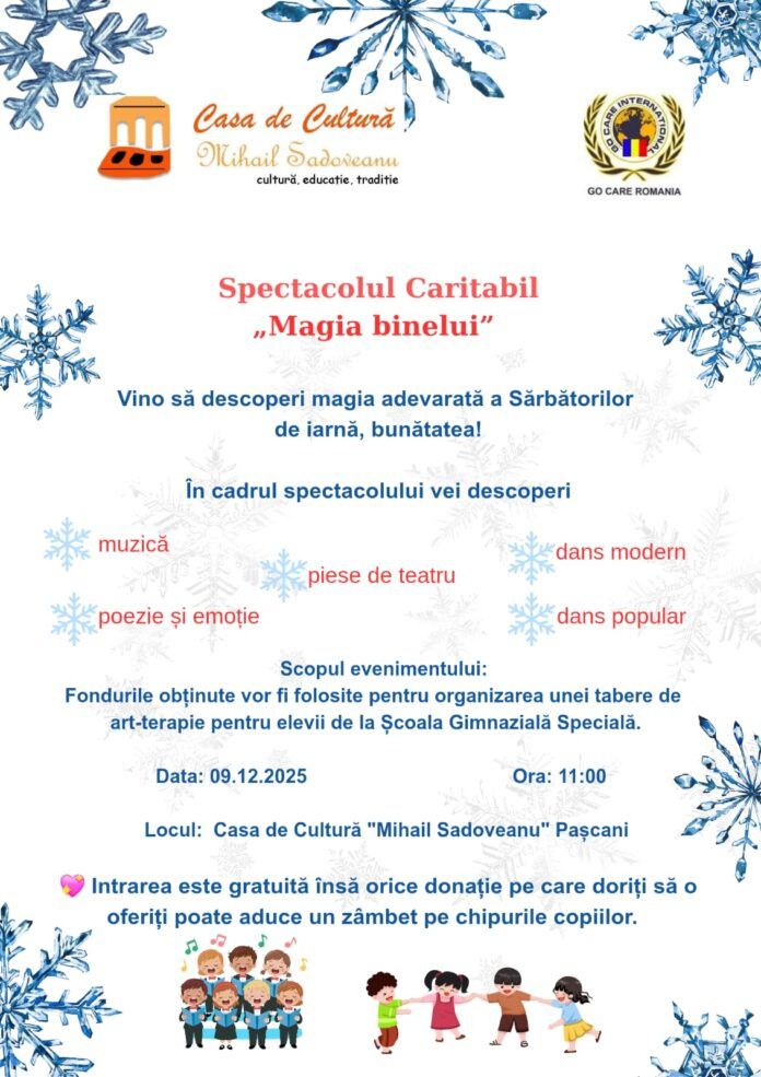 Spectacol caritabil „Magia binelui” la Pașcani. Evenimentul, organizat de Asociația Go Care România, va avea loc pe 9 decembrie, de la ora 11:00, la Casa de Cultura Mihail Sadoveanu. Fondurile obținute vor fi folosite pentru organizarea unei tabere de art-terapie pentru elevii de la Școala Gimnazială Specială din municipiu.
