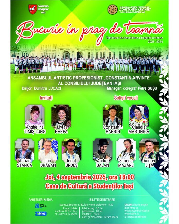 Ansamblul artistic profesionist Constantin Arvinte al Consiliului Județean Iași își deschide joi, 4 septembrie, noua stagiune 2025-2026, printr-un spectacol organizat la Casa de Cultură a Studenților din Iași. Evenimentul, intitulat „Bucurie în prag de toamnă”, va începe la ora 18.00 și va aduce pe scenă orchestra, dansatorii și soliștii vocali ai ansamblului, alături de cinci invitați speciali care vor reprezenta diferite zone folclorice ale României.