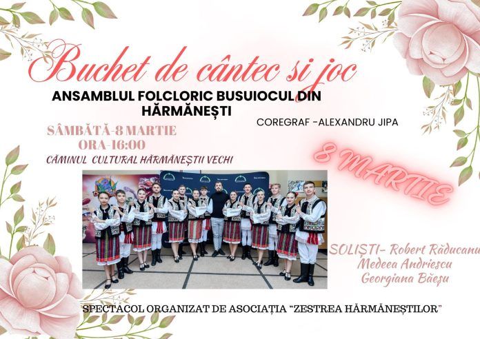 Spectacol folcloric la Căminul Cultural din Hărmăneștii Vechi, de Ziua Mamei, pe 8 martie. Sub motto-ul „Buchet de cântec și joc”, Asociația „Zestrea Hărmăneștilor” vă invită la un eveniment cu folclor autentic. Pe scenă vor fi Ansamblul Folcloric Busuiocul din Hărmănești, coordonat de coregraful, Alexandru Jipa și mai mulți soliști vocali.
