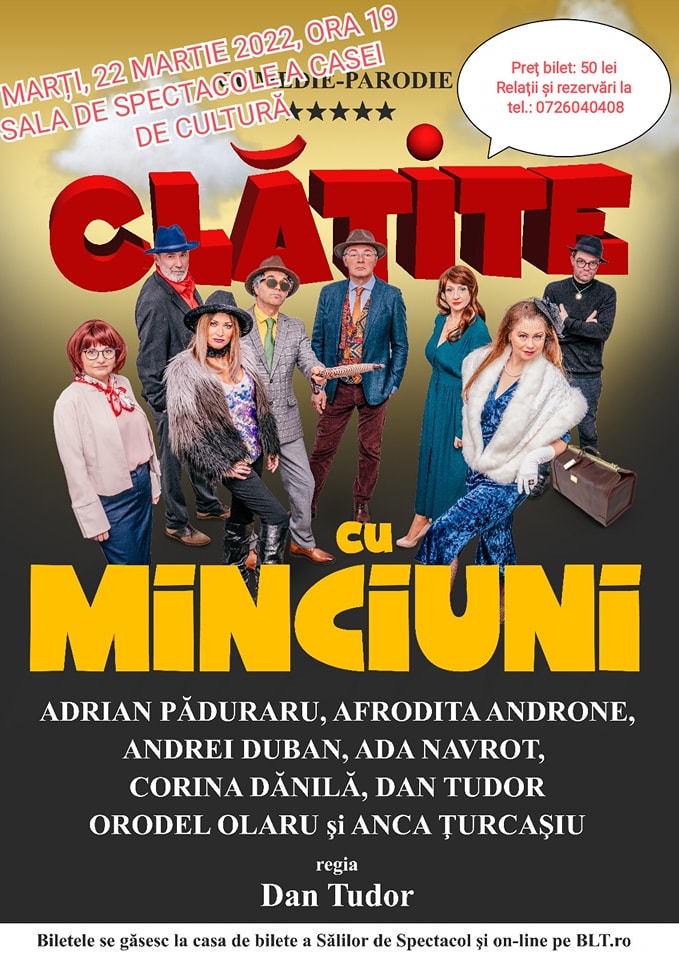 Cu prilejul Zilei Mondiale a Teatrului, Casa Municipala de Cultura din Pașcani va invita la un spectacol de comedie. Evenimentul va avea loc marți, 22 martie, începând cu ora 19:00. Prețul unui bilet este de 50 de lei, iar rezervări se pot face la numărul de telefon 0726 04 04 08.