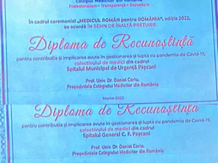 Evenimentul a fost organizat de Colegiul Medicilor din România la Palatul Parlamentului din Bucureşti. Toate spitalele COVID şi suport COVID din ţară, inclusiv din Iaşi, au primit câte o „diplomă de recunoştinţă” pentru modul în care au gestionat pandemia, pentru „contribuţia şi implicarea avute în gestionarea şi lupta cu pandemia de COVID-19”.