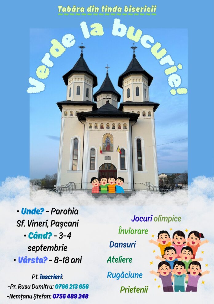 Parohia „Sfânta Vineri” din Pașcani organizează, în perioada 3–4 septembrie, o tabără dedicată copiilor și tinerilor cu vârste cuprinse între 8 și 18 ani, desfășurată sub genericul „Verde la bucurie!”.