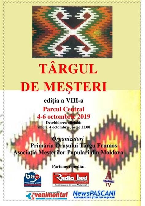 Primăria Oraşului Târgu Frumos şi Asociaţia Meşterilor Populari din Moldova organizează în perioada 4-6 octombrie 2019 cea de-a VIII-a ediţie a Târgului de Meşteri în Parcul Central „Ing. Dan Dumitrachi” din Târgu Frumos.