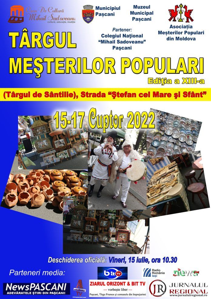 Sfârșitul săptămânii viitoare aduce la Pașcani un eveniment cu și despre tradiții. În perioada 15-17 iulie, în centrul municipiului va avea loc cea de-a XIII-a ediție a Târgului Meşterilor Populari, manifestare cunoscută în ultima vreme că Târgul de Sântilie. 69 de meşteri şi creatori populari din întreaga ţară și din Republica Moldova, vor promova în oraș meşteşugurile artistice tradiţionale, în spiritul cunoaşterii, preţuirii şi respectului pentru tradiţii şi bun gust.