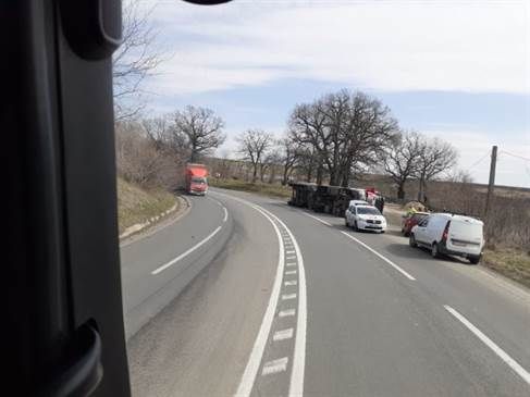 Un accident de circulație s-a petrecut în curbele de la Strunga, zona Trei Iazuri, în jurul orei 13:00. Un TIR încărcat cu semințe de floarea soarelui s-a răsturnat la marginea drumului, iar șoferul nu poate ieși din cabină.