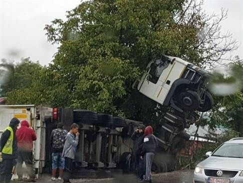 Un tir s-a răsturnat în curtea unei locuințe construite pe marginea drumului principal din orașului Târgu Frumos.
