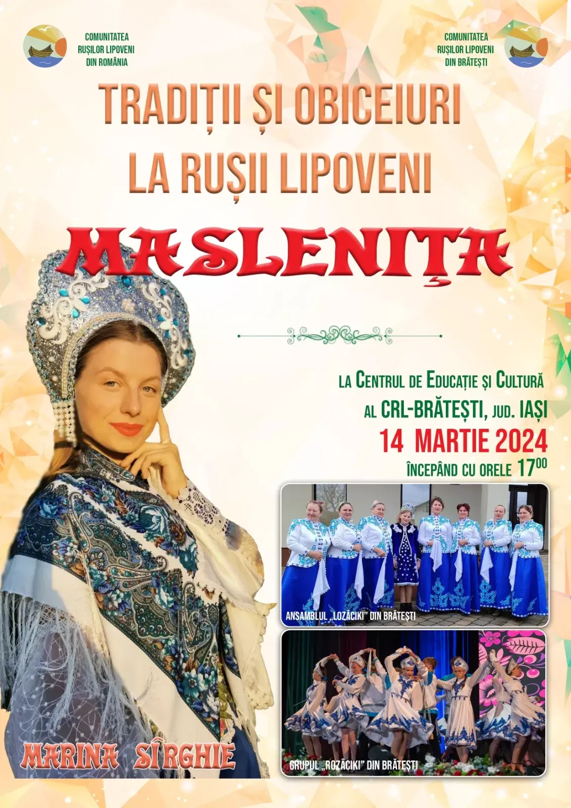 Comunitatea Rusilor Lipoveni din Brătești vor sărbători într-un mod tradițional, trecerea de la iarnă la primăvară. Joi, 14 martie, la Centrul de Educație și Cultură din localitate, de la ora 17:00, vor avea loc tradiții și obiceiuri specifice acestor minorități, în cadrul sărbătorii Maslenița.