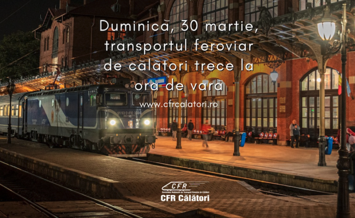 Trenurile operate de CFR Călători vor circula după ora actuală (de iarnă) până în noaptea de 29/30 martie a.c. la ora 03:00, care va deveni ora 04.00. După ora 04.00, trenurile vor pleca la orele din mersul de tren în vigoare, respectând ora oficială de vară.