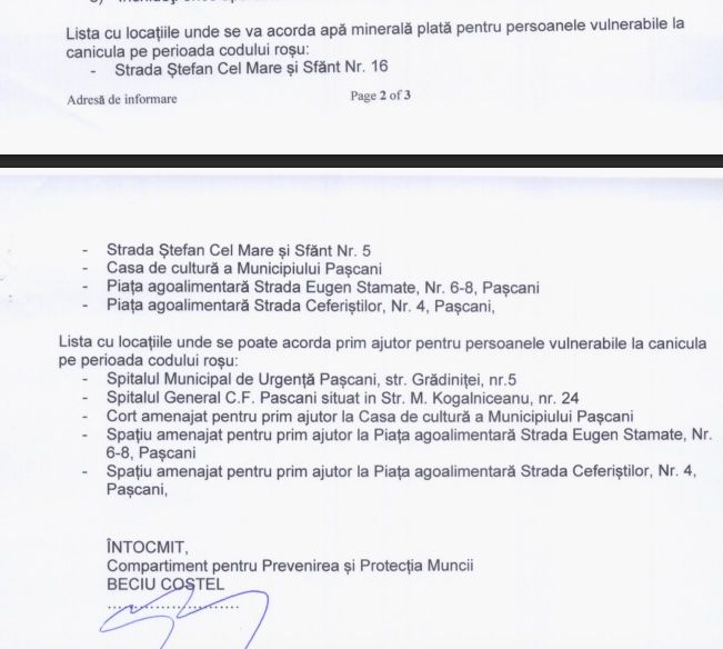 Documentul a fost întocmit de Costel Beciu, șeful Compartimentului pentru Prevenirea și Protecția Muncii. Bit TV a atras atenția și a solicitat să fie completat, dar a rămas nemodificat. De asemenea, sunt semne de întrebare nu doar privind locațiile exacte, ci și dacă Primăria are rezervată și pune într-adevăr la dispoziție o cantitate de apă de băut pentru persoanele vulnerabile.