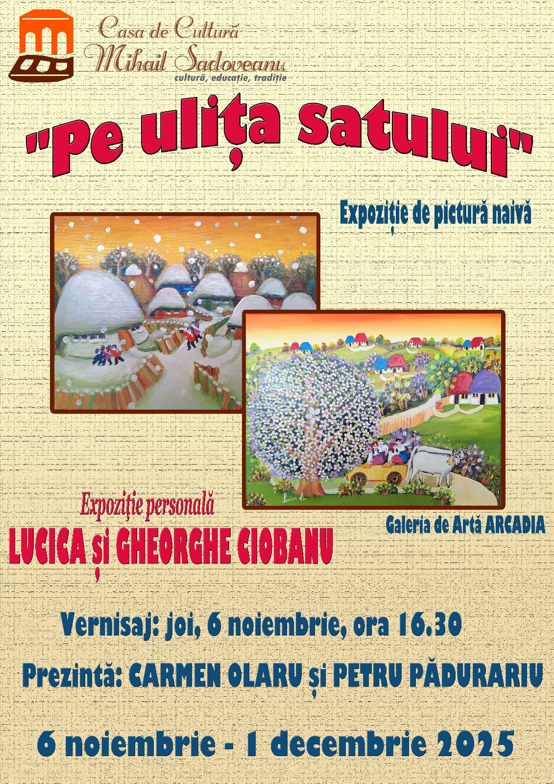 Vă invităm joi, 6 noiembrie 2025, ora 16.30 la vernisajul expoziției de pictură naivă ,,Pe ulița satului” în sala Arcadia a Casei de Cultură. Expoziția personală a pictorilor Lucica și Gheorghe Ciobanu va fi vernisată de Carmen Olaru și Petru Pădurariu.