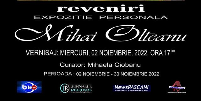 C.P. Iubitorii de artă sunt așteptați miercuri, 2 noiembrie, ora 17.00 în sala Arcadia a Casei de Cultură la vernisajul expoziției pictorului romașcan, Mihai Olteanu . Aflat la cea de-a doua expoziției personală la Pașcani cu titlul sugestiv ,,Reveniri”, vernisajul va fi realizat de d-na Mihaela Ciobanu de la Muzeul de Artă din Roman.