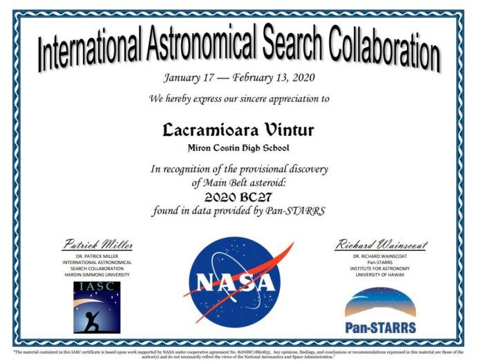 C.P. Zilele acestea organizaţia International Astronomical Search Collaboration a inclus o descoperire efectuată de elevii noştri, în campania din perioada 17 ianuarie – 13 februarie 2020, în categoria „provisional discovery”. Este vorba de un asteroid din centura principală de asteroizi dintre planetele Marte şi Jupiter, numele provizoriu fiind „2020 BC27”. Elevii implicaţi în descoperire sunt Alina Duca din clasa a XII-a, Gabriela Bocovanu din clasa a X-a şi Lăcrămioara Vîntur tot din clasa a X-a.
