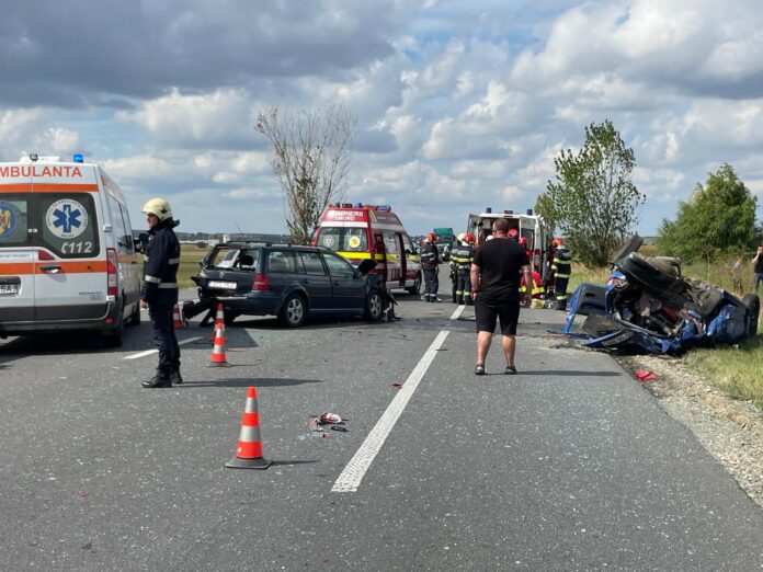 Unul dintre autoturisme arată ca un maldăr de fiare pe marginea șoselei.