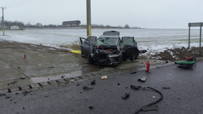 În accident au fost implicate un microbuz și un autoturism. În urma impactului, microbuzul a ajuns în șanț, iar mașina în afara carosabilului, partea din față fiind zdrobită.