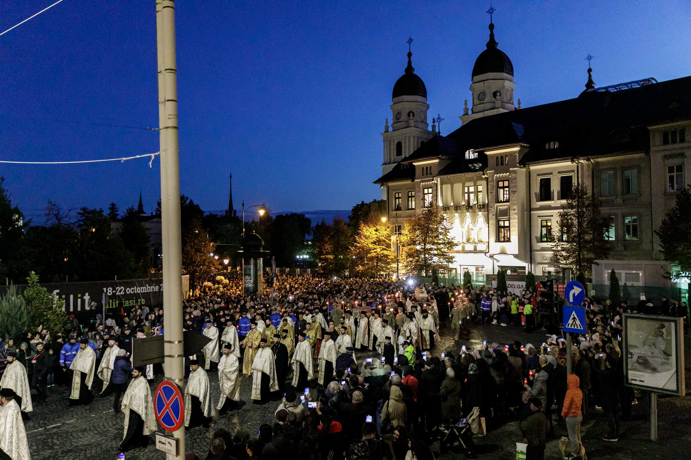 Aproximativ 20.000 de persoane au participat, duminică seară, la Iaşi, la pelerinajul intitulat Calea Sfinţilor, racla cu moaştele Sfintei Cuvioase Parascheva fiind purtată de către preoţi pe străzile din centrul municipiului.
