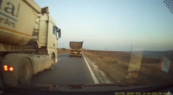 În imagini se vede cum șoferul camionului încearcă pur și simplu să îl scoată de pe șosea pe un pe un alt conducător auto, care depășise regulamentar.Camionul se plimbă de pe o bandă pe alta și nu permite să fie depășit. Un al doilea șofer de camion semnalizează o angajare în depășire, și numai printr-o mare șansă nu s-a ajuns la un accident.