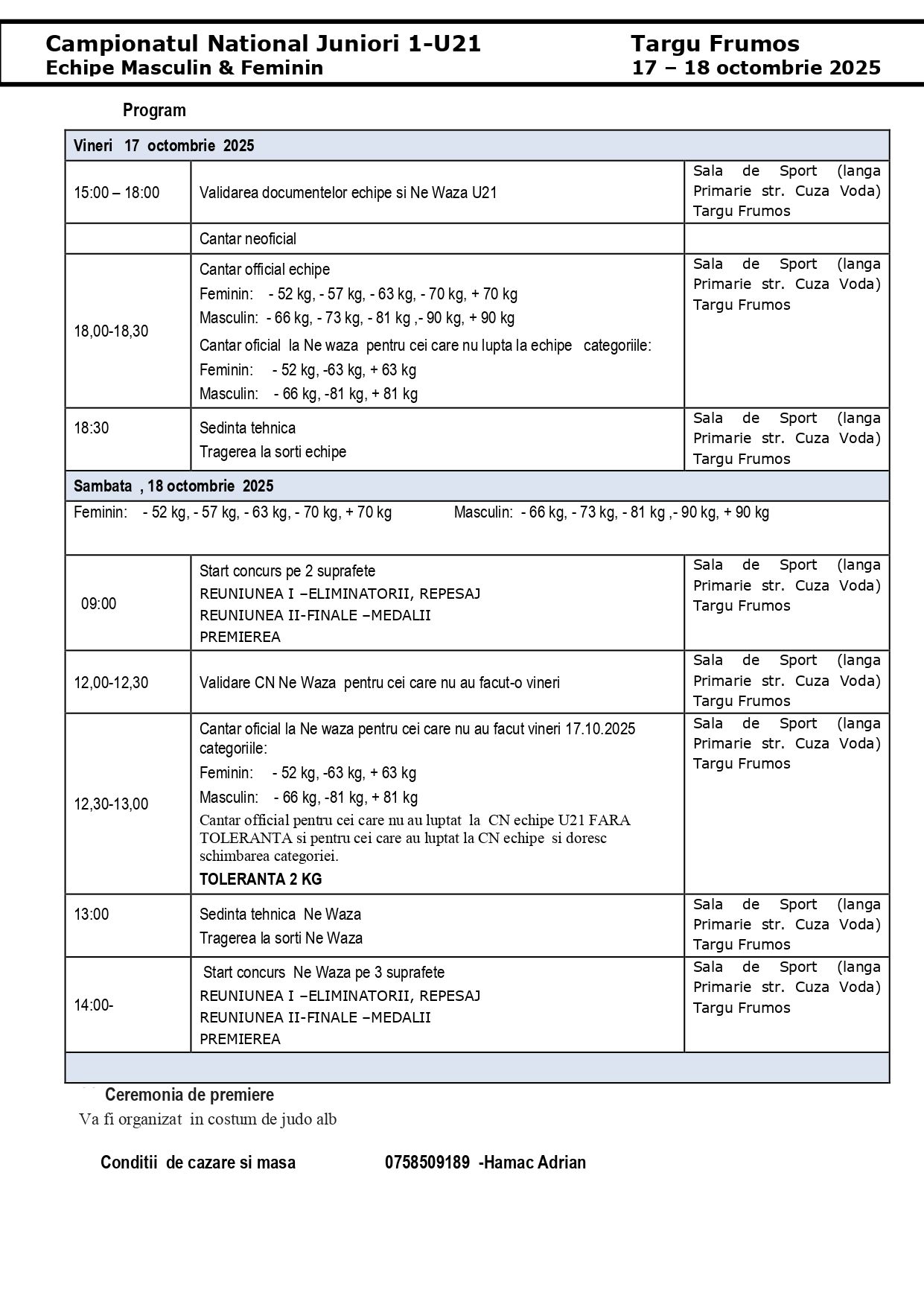 Primăria Târgu Frumos: Finala Campionatului Național U21 la Echipe și Ne-Waza de la Târgu Frumos din perioada 17-18 octombrie 2025 reprezintă un eveniment important în calendarul competițional al judo-ului românesc. Această competiție reunește cei mai promițători tineri judoka sub 21 de ani, care luptă pentru titlurile naționale la două discipline distincte: concursul pe echipe și proba de Ne-Waza (lupta la sol).