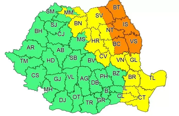 În județele Botoșani, Iași și Vaslui, precum și în zona joasă a județelor Suceava, Neamț și Bacău va ninge și se va depune strat nou de zăpadă consistent. Vântul va avea intensificări cu viteze de 55…75 km/h, va fi viscol și vizibilitate foarte scăzută. Local se vor cumula 30…50 l/mp.