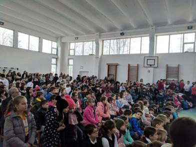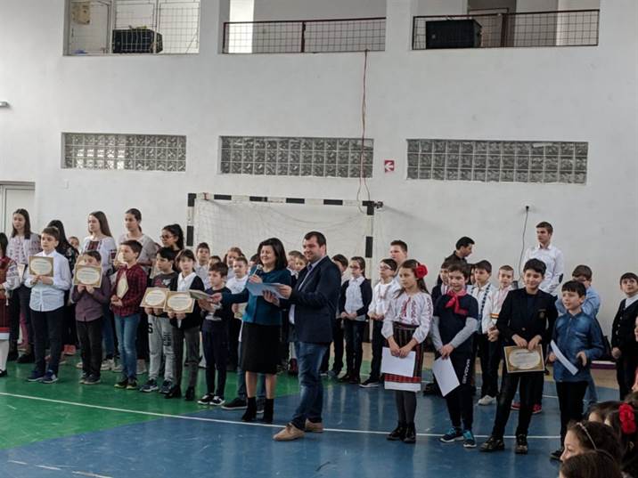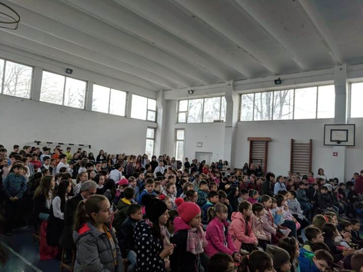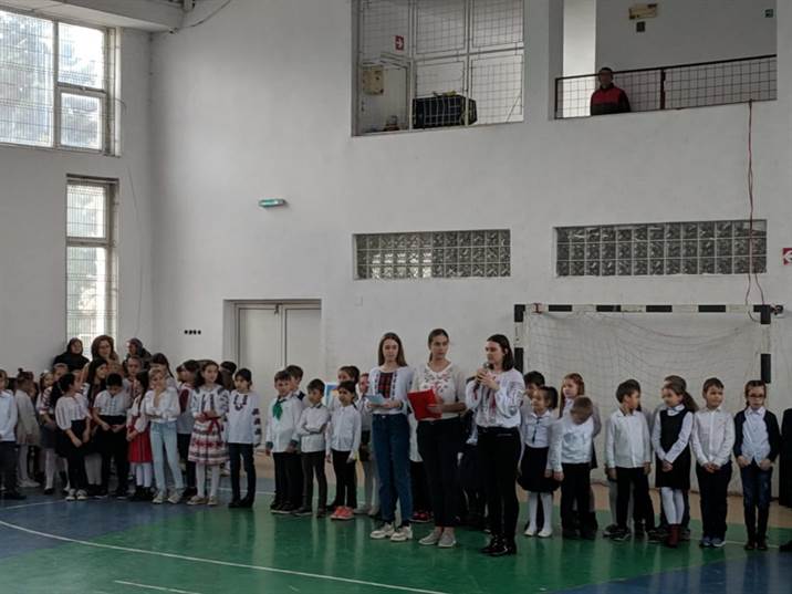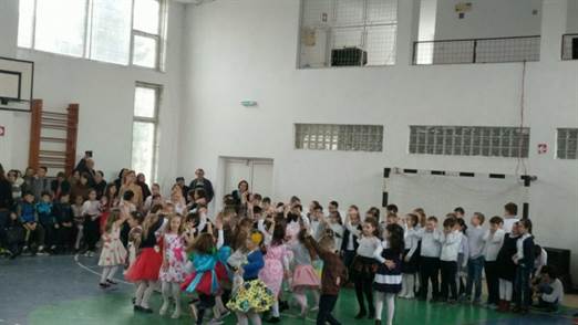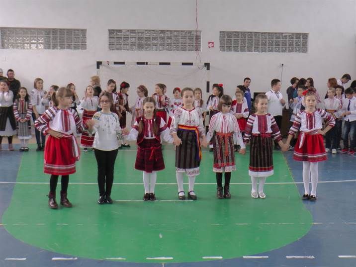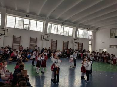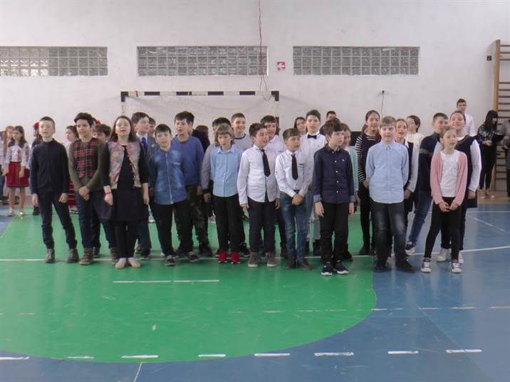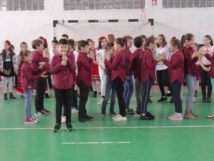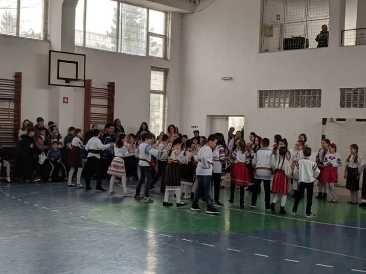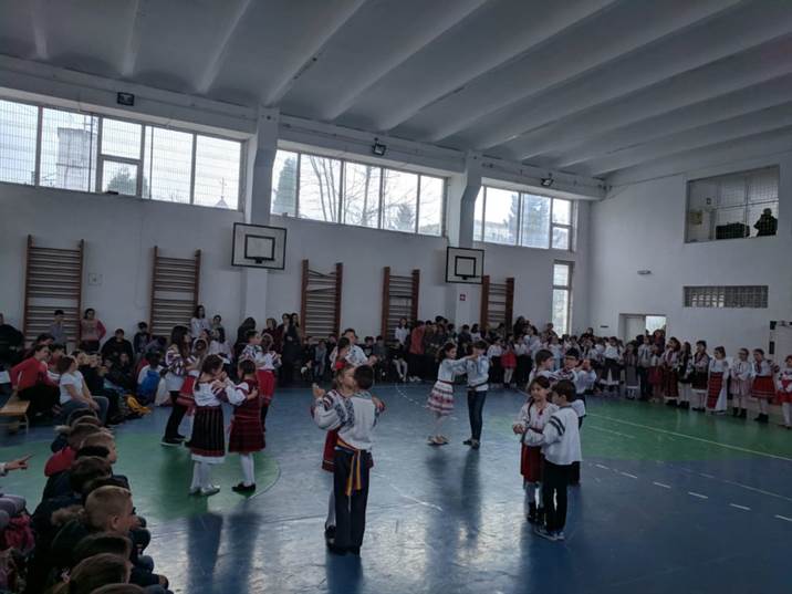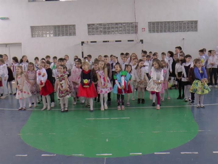Festivitatea de luni 25 martie a fost marcată de un spectacol artistic susținut de elevii școlii, care s-au adunat în sala de sport a unității de învățământ și au cântat, au dansat și au recitat poezii.