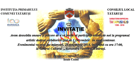 Program artistic în comună Tătăruşi, dedicat Zilei naţionale a României, în an de centenar. Evenimentul este programat în ziua de miercuri 28 noiembrie începând cu ora 17.00 Centrul Cultural „Alexandru Vasiliu – Tătăruşi. Primăria comunei organizează mai multe activităţi omagiale şi un spectacol artistic susţinut de artiştii locali. Totodată vor fi aprinse luminile festive pentru sărbătorile de iarnă.