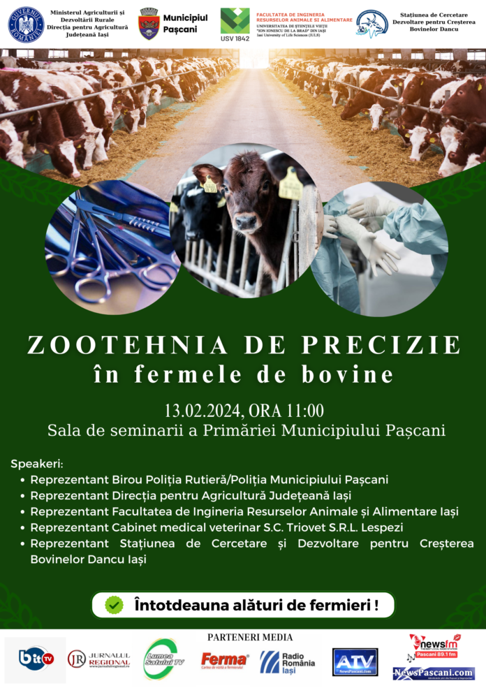 În data de 13.02.2024, începând cu orele 11.00, în sala de seminarii a Primăriei Municipiului Paşcani, Direcţia pentru Agricultură Judeţeană Iaşi, în parteneriat cu Primăria Municipiul Pașcani, cu sprijinul Facultății de Ingineria Resurselor Animale și Alimentare Iași, al Stațiunii de Cercetare și Dezvoltare pentru Creșterea Bovinelor Dancu, Iași și al specialiștilor din domeniul medicinei veterinare, vor organiza un eveniment dedicat crescătorilor de bovine din localităţile aflate ȋn zona Municipiului Paşcani: Zootehnia de precizie în fermele de bovine.